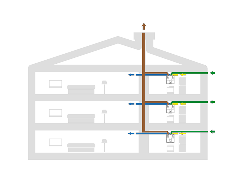 Mit Geräten in den Wohneinheiten und einer Bedarfssteuerung kann die Lüftung weitestgehend an die Bedürfnisse des Wohnbereichs angepasst werden. Die bedarfsgesteuerte Lüftung, die in der Regel in Schulen und Büros eingesetzt wird, wird auch immer häufiger in Wohnhäusern verwendet.