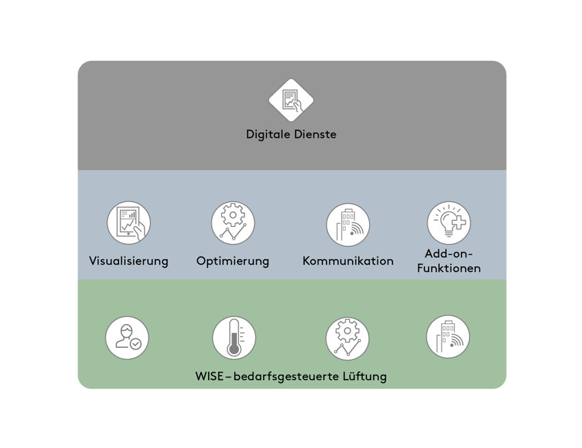 ​WISE enthält immer ein Grundpaket, um ein bedarfsgesteuertes Raumklima zu erreichen. Ergänzend zum Grundpaket können einige Lösungen wie Visualisierung, Optimierung, Kommunikation und verschiedene Funktionalitäten hinzugefügt werden. Darüber hinaus können auch einige digitale Dienste hinzugefügt werden:​