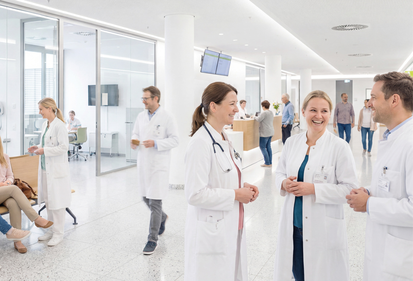 Klimadecken bieten eine besonders gleichmäßige und zugluftfreie Möglichkeit, Räume zu klimatisieren. Als wasserbasierte Heiz- und Kühldecken arbeiten sie nach dem Prinzip der Strahlung und Konvektion, sorgen für gleichmäßige Temperaturen und kommen ohne Ventilatoren aus, so dass sie leise und optisch unauffällig funktionieren. So entsteht ein stabiles, angenehmes Raumklima, das sowohl Patientenkomfort fördert als auch die Arbeit des medizinischen Personals unterstützt.