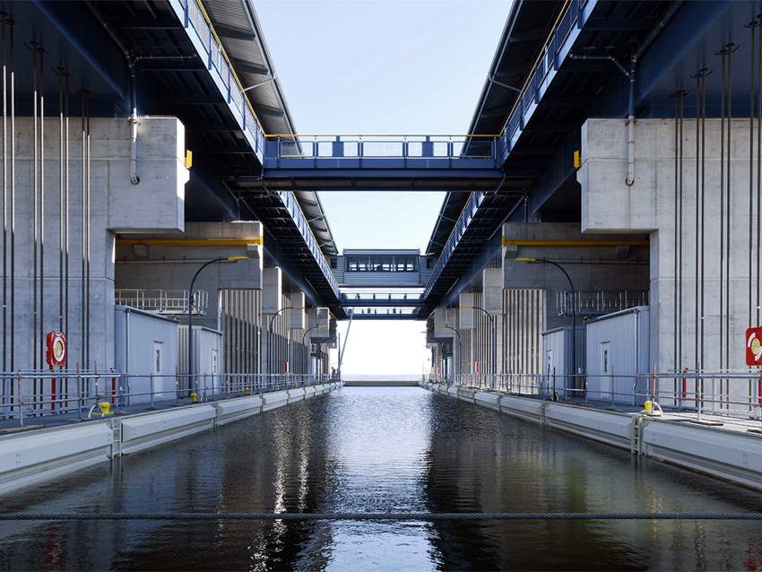 Wenn man im Trog des Schiffshebewerks Niederfinow, zwischen Havel und Oder hinab Richtung Oder fährt, geht es trotzdem „zu Berg“.