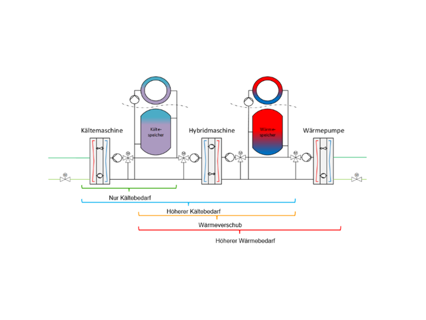 Während der Kühl- und Heizperiode fallen in einem der beiden Neubauten Abwärme an. Um diese sinnvoll ein zu setzen und nicht ungenutzt über das Grundwasser abzuführen, wurden in der Anlagentechnik Energieverschiebungen eingeplant, um eine möglichst energieeffiziente und nachhaltige Energiebereitstellung zu realisieren. Die Besonderheit dieses Areals ist die Hybridmaschine, welche für die Energieverschiebung, sowohl für die Kühlung als auch Heizung eingesetzt. Die übrige Abwärme wird in einen Warmspeicher geleitet und die Kälte in einen Kaltspeicher. So kann die jeweilige Energie zur Beheizung und Kühlung des Gebäudes verwendet werden.