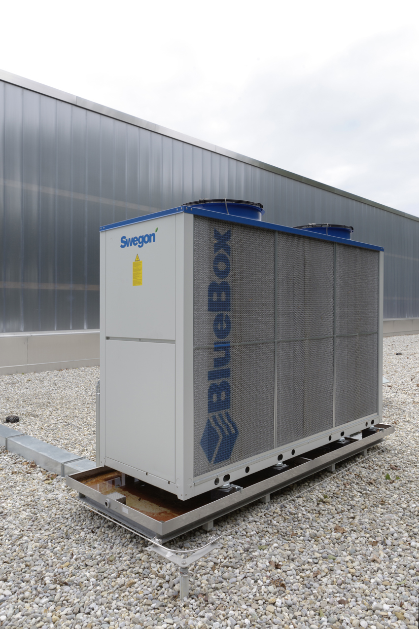 Die Zuluft wird nach dem Adsorptionsprozess zusätzlich sensibel konditioniert. In der Lüftungsanlage ist hierzu ein Direktverdampfungsystem verbaut worden. Mittels eines BlueBox Verflüssigungssatzes Typ ZETA LE SLN 8.2 mit drehzahlgeregelten Verdichtern und Saugdruckregelung wird die in die Eishalle eingebrachte, entfeuchtete Prozessluft abgekühlt.