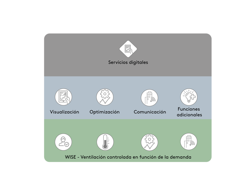 WISE incluye siempre un paquete básico para conseguir un clima interior controlado en función de la demanda. Además del paquete básico, se pueden añadir una serie de soluciones, como visualización, optimización, comunicación y diversas funcionalidades. Además, también se pueden añadir una serie de servicios digitales: