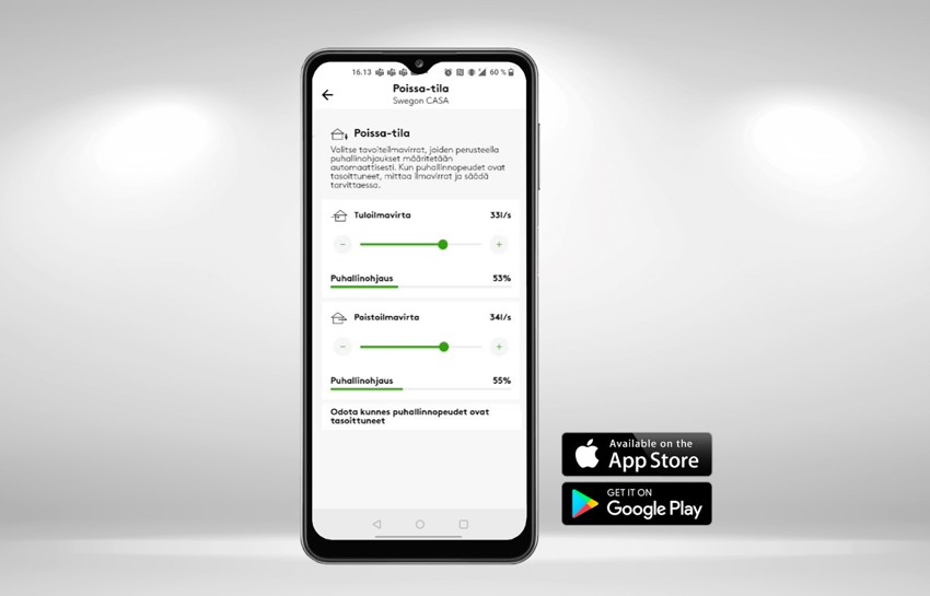 Kodin asukkaan sovellus jolla voi käyttää kaikkia käyttöpaneelin toimintoja etänä omalta älypuhelimelta. Sovelluksen avulla käyttäjä saa enemmän tietoa asunnon ilmanlaadusta ja hyödyllisiä ohjeita ja neuvoja asunnon ilmanvaihdon käyttämiseen (tarvitsee Swegon Genius -ohjauspaneelin).