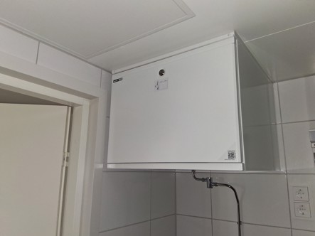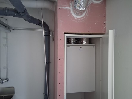 Ilmaa vaihtaa ja lämmön ottaa talteen Swegonin CASA W4xs Genius: rakenteeltaan matala, ääneltään hiljainen ja älykäs ilmanvaihtokone. COfLOW´n periaatteiden mukaan asennustyötä vauhditettiin asentamalla ilmanvaihtokone kylpyhuonemoduulin kattoon jo tehtaalla Hämeenlinnassa. Kattoasennuksen vuoksi ilmanvaihtokoneen alle mahtuu pesutorni.