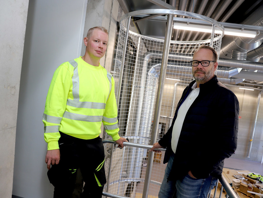 Rauman kaupungin LVI-yksikön päällikkö Toni Suursoho ja Eetu Sainio ilmanvaihtourakoinnista vastanneesta Vesi-Lammelasta kiertelevät tyytyväisen näköisinä asemalla. Loppusilausta lukuun ottamatta kaikki näyttää olevankin pian kunnossa.