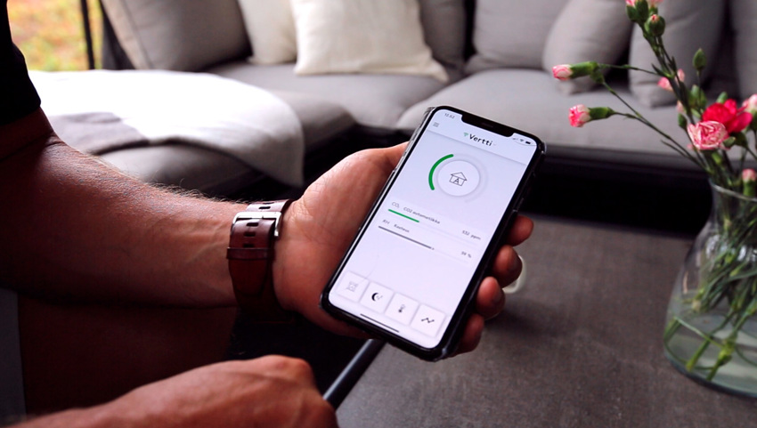Laitteeseen kuuluu myös älypuhelinsovellus, josta voi halutessaan säätää ilmanvaihtoa itse. Automatiikan ansiosta siihen ei tarvitse käytännössä koskaan puuttua. Mutta sisäilman seuraaminen sovelluksesta on silti mielenkiintoista: