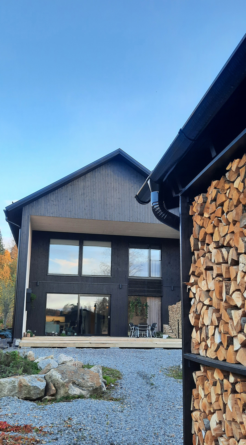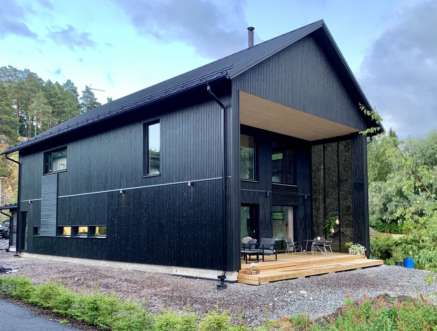 Vuonna 2020 viisihenkinen perhe rakensi upean omakotitalon meren rannalle Turun seudulle. Pariskunta suunnitteli talon yhdessä arkkitehdin kanssa ja lopputuloksena rakentui näyttävä musta puuverhoiltu talo, joka on rakennettu nykystandardien mukaan energiatehokkaaksi kokonaisuudeksi.