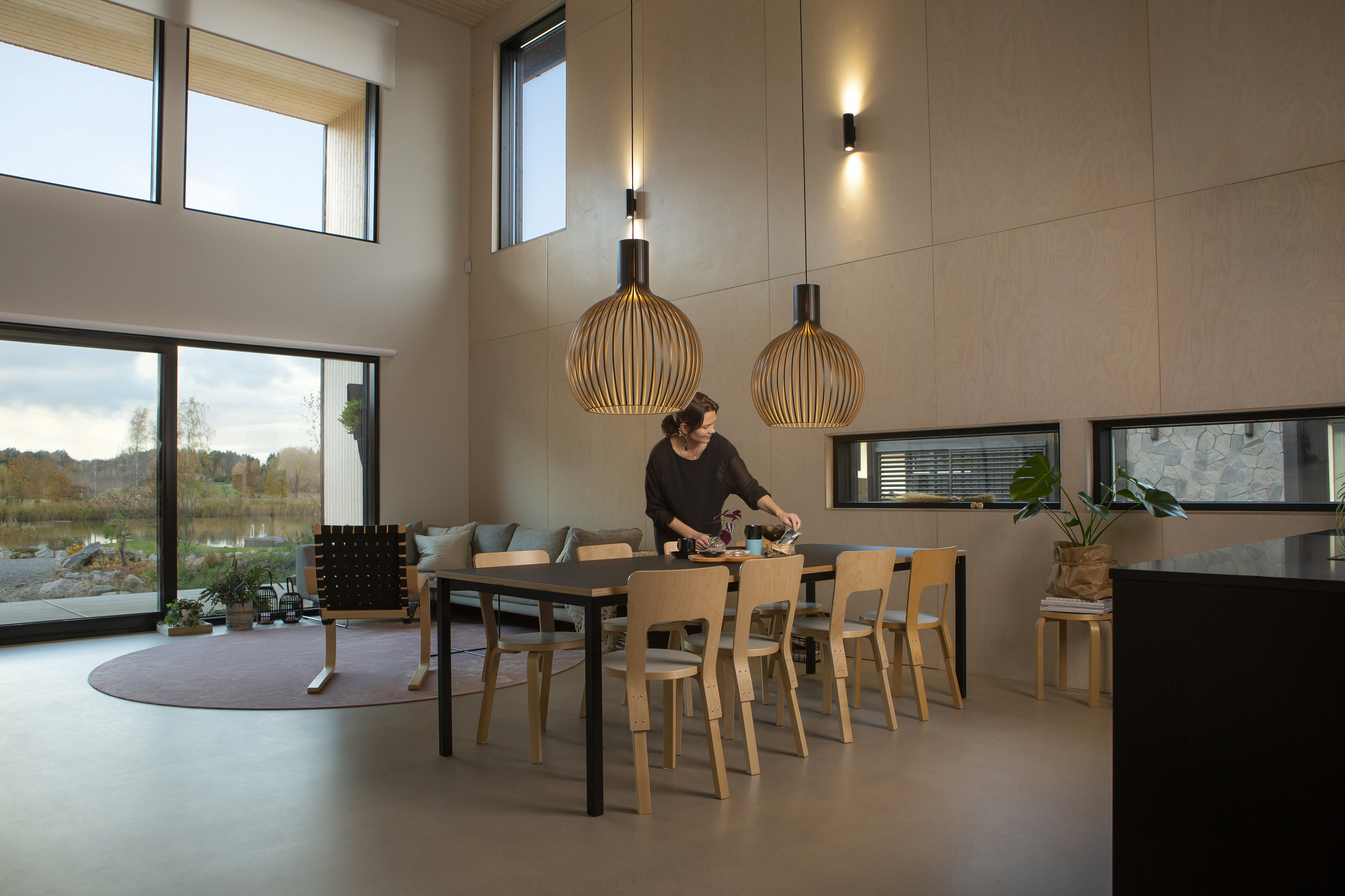 Kodin sisustuksessa on käytetty paljon erilaisia puupintoja, jotka luovat lämpimän tunnelman eri tiloihin. Sisustuksessa perhe arvostaa vanhan ja uuden yhdistämistä. ”Vanhat nettikirpparilöydöt ja uusi kotimainen design kulkevat tässä kodissa käsi kädessä”, kertovat talon omistajat. Yrittäjätaustainen perhe arvostaa myös paikallisuutta, joten rakennus- ja sisustustöissä on käytetty mahdollisimman paljon paikallisten yritysten palveluja ja tuotteita. Tästäkin syystä Swegon oli luonnollinen valinta. Swegon CASA -ilmanvaihtokoneet nimittäin valmistetaan Suomessa ja Turun kupeessa Kaarinan tehtaalla.