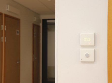 WISE OCS -anturi ja WISE RTA -asetusarvosäädin käytävässä.