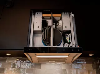Le R2 peut être installé dans la cuisine, au-dessus de la cuisinière, avec une hotte aspirante. Il peut être recouvert d'une porte de placard, ce qui permet une intégration complète de l'appareil dans le meuble de cuisine. Une plaque de finition blanche, noire ou en acier inoxydable est disponible en accessoire.