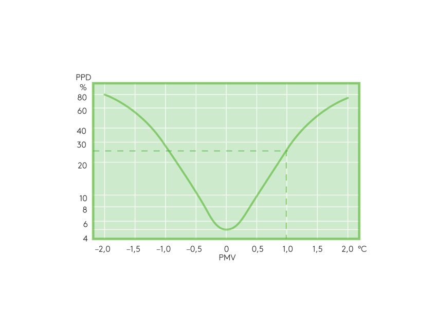 Sur la base des valeurs PMV et PPD définies dans la norme ISO 7730, des exigences peuvent être définies pour le climat thermique d'un bâtiment. Selon les valeurs PPD définies comme exigences et les niveaux d'activité et les facteurs vestimentaires incorporés dans ces exigences, les critères résultants exigent que la température opérationnelle soit comprise entre 20 et 24 degrés en hiver et entre 23 et 26 degrés en été.