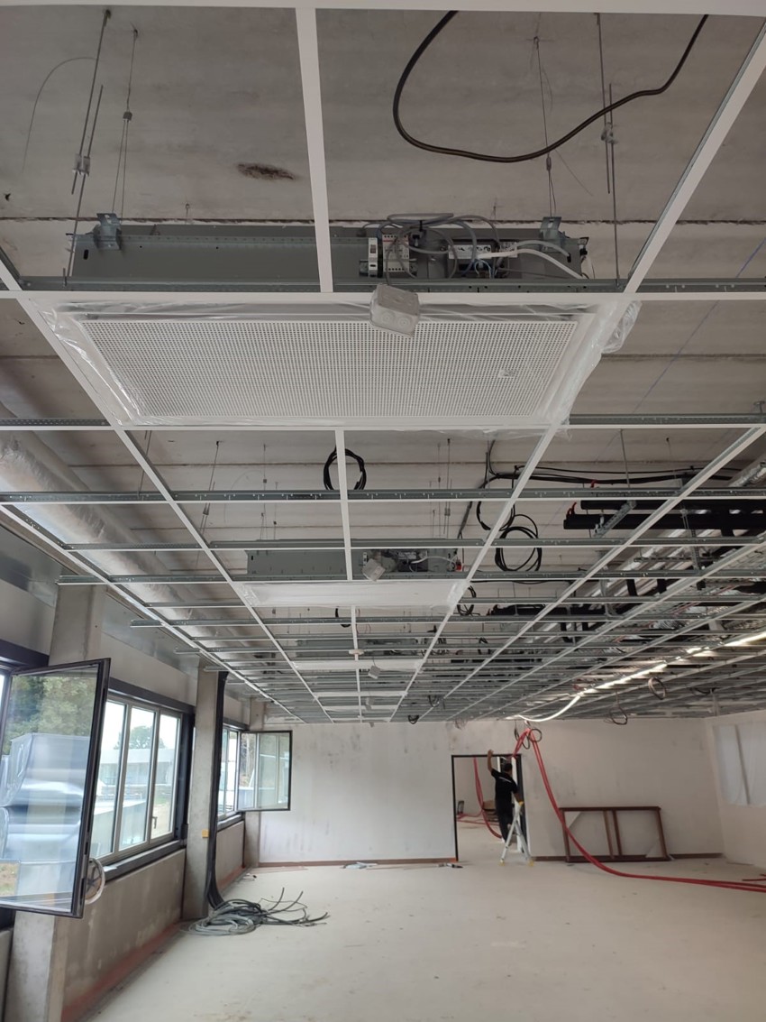 Les diffuseurs BOC, installés dans la zone industrielle, assurent un chauffage et un refroidissement efficaces à faible vitesse d’air, tandis que les poutres climatiques PARASOL Zenith (photo ci-contre, prise lors de l'installation des poutres), intégrés dans les bureaux, garantissent un confort thermique et acoustique optimal en parfaite synergie avec le système WISE.