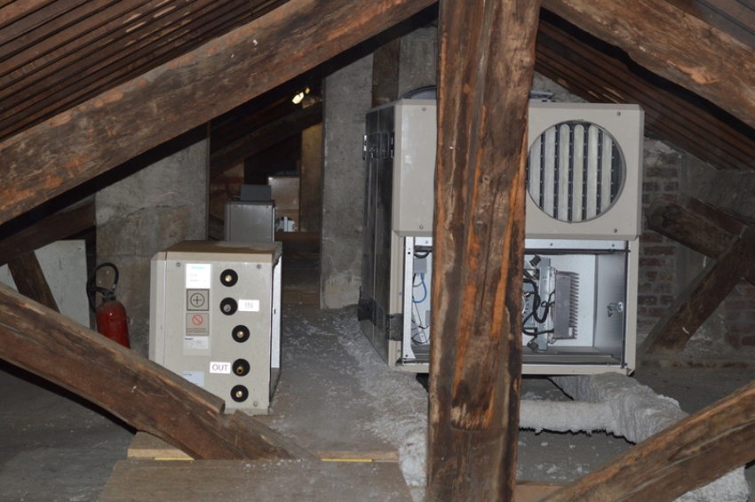 Pour compléter le nouveau systême de chauffage, des centrales de traitement d’air ont été installées. Au nombre de neuf, elles ont pris place dans les combles, tout le long du bâtiment de l’Ordre.