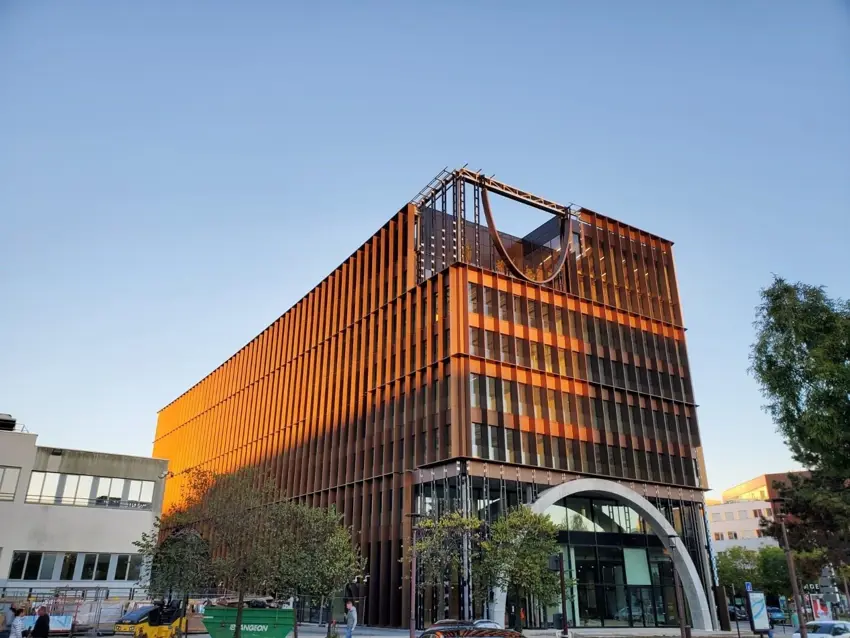 L’édifice se distingue par son architecture innovante et l’utilisation de matériaux durables. Conçu en BIM par Baumschlager Eberle Architekten en collaboration avec Egis et Elioth, il intègre béton, bois lamellé-collé, métal et verre, tout en adoptant une démarche de réemploi (avec, par exemple, la récupération de faux planchers). Son immense atrium, surmonté d’une charpente en bois et d’une verrière, assure une ventilation naturelle, complétée par une toiture végétalisée favorisant l’agriculture urbaine.