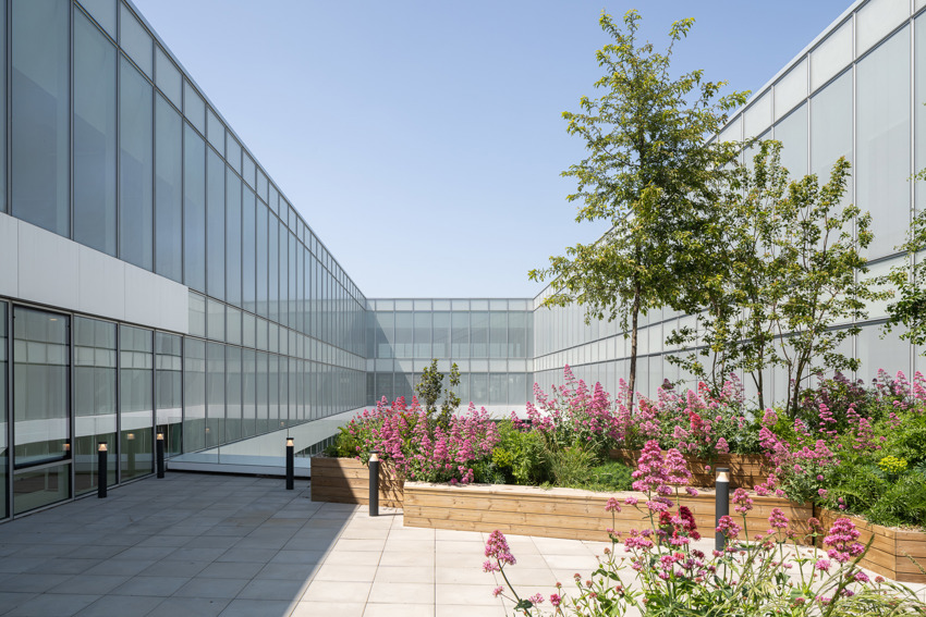 L’immeuble est doté d’innombrables espaces de détente et d’espaces flexibles poussant à la collaboration et à la créativité. Le bâtiment est en forme de U où à l’intérieur se trouve un espace central ouvert sur la ville, qui permet aux collègues et riverains de se retrouver le temps d’une pause ou d’un déjeuner.