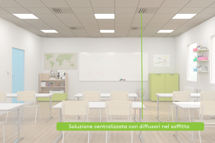 La ventilazione centralizzata significa che il riscaldamento e il raffreddamento avvengono in un punto centrale, con l'aria che fluisce verso le aule attraverso i condotti.