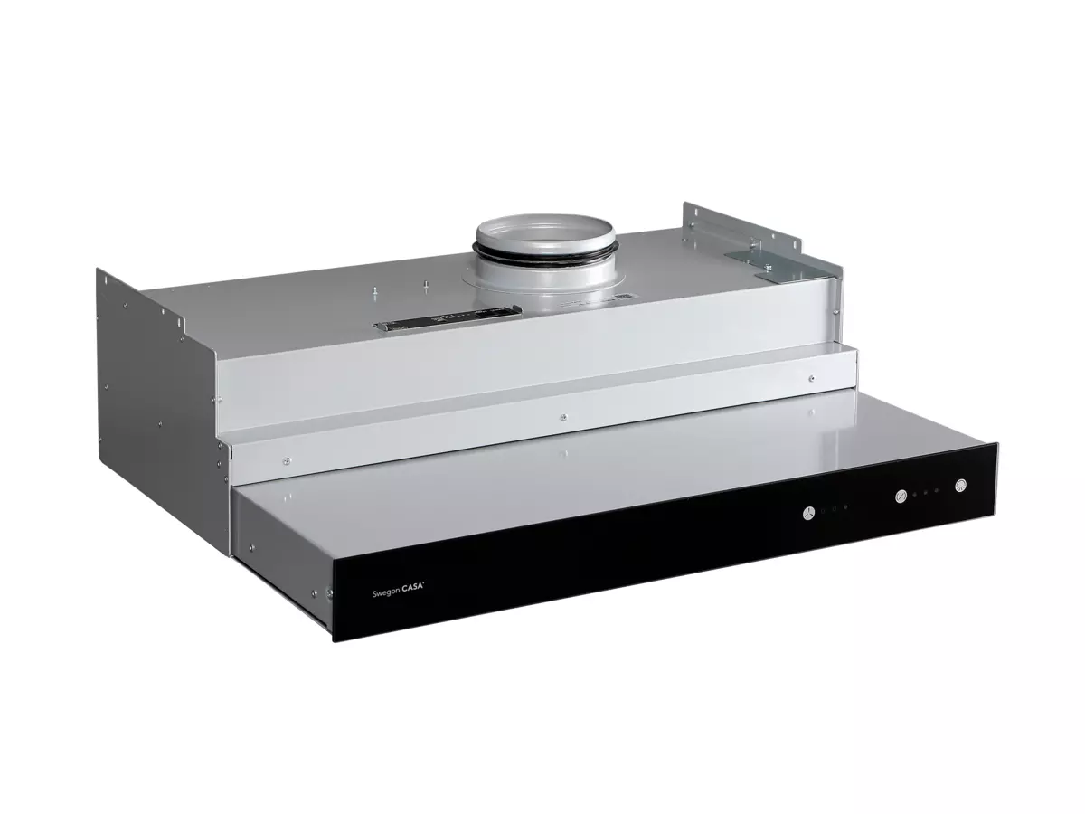 CASA SALSA is an extensible cooker hood that integrates perfectly in line with the kitchen cabinets when not in use and is pulled out during the cooking. The smooth surfaces and wash proof metal grease filters are easy to keep clean. The lighting in the hood is made up of maintenance-free LED lights with adjustable brightness. The cooker hood with voltage protection (24 V) is equipped with a mains transformer – its power consumption is therefore low and the hood is always safe for the user. All electrical connections are located above the hood and are therefore quick and easy to connect during the installation phase.