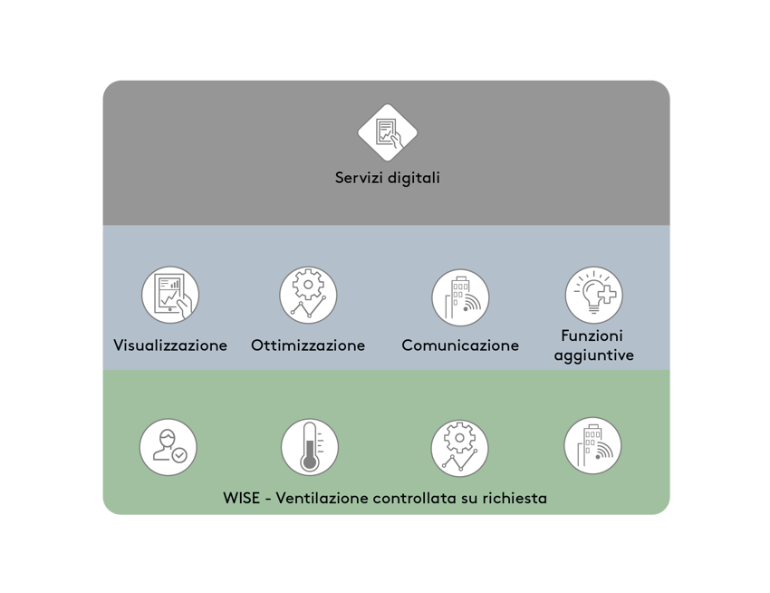 ​WISE include sempre un pacchetto base per ottenere una climatizzazione interna controllata su richiesta. Oltre al pacchetto base, possono essere aggiunte diverse soluzioni come visualizzazione, ottimizzazione, comunicazione e varie funzionalità. In aggiunta a tutto ciò, possiamo aggiungere anche diversi servizi digitali:​
