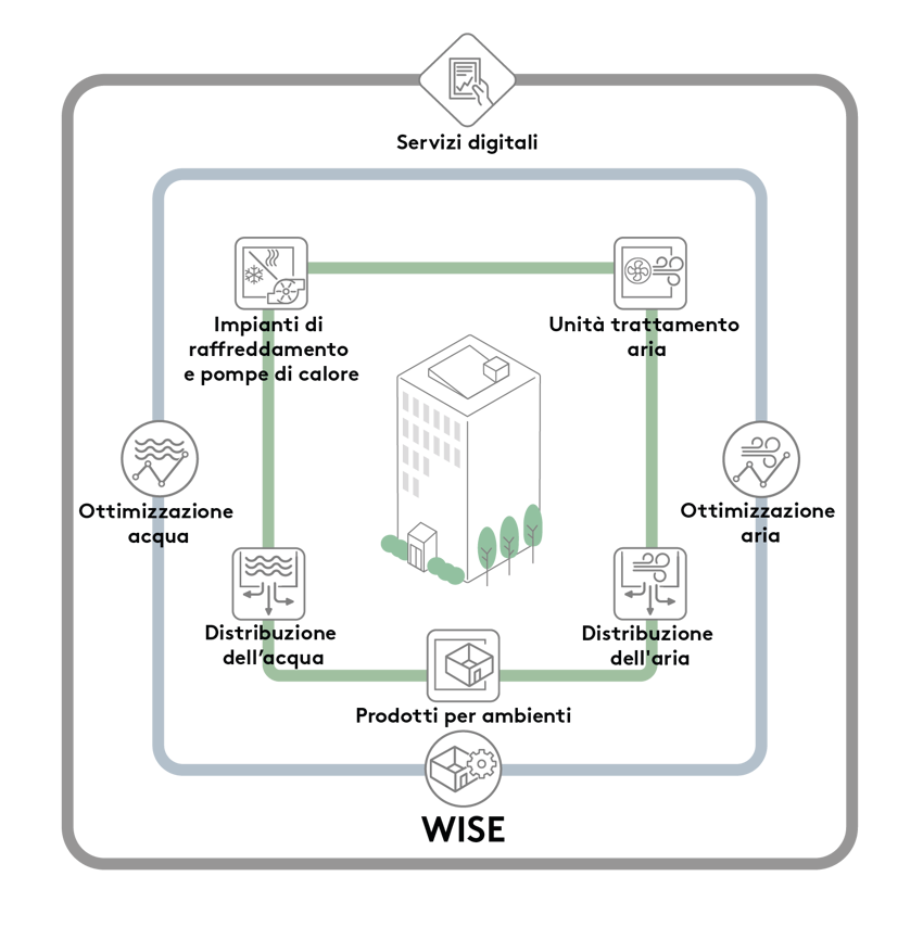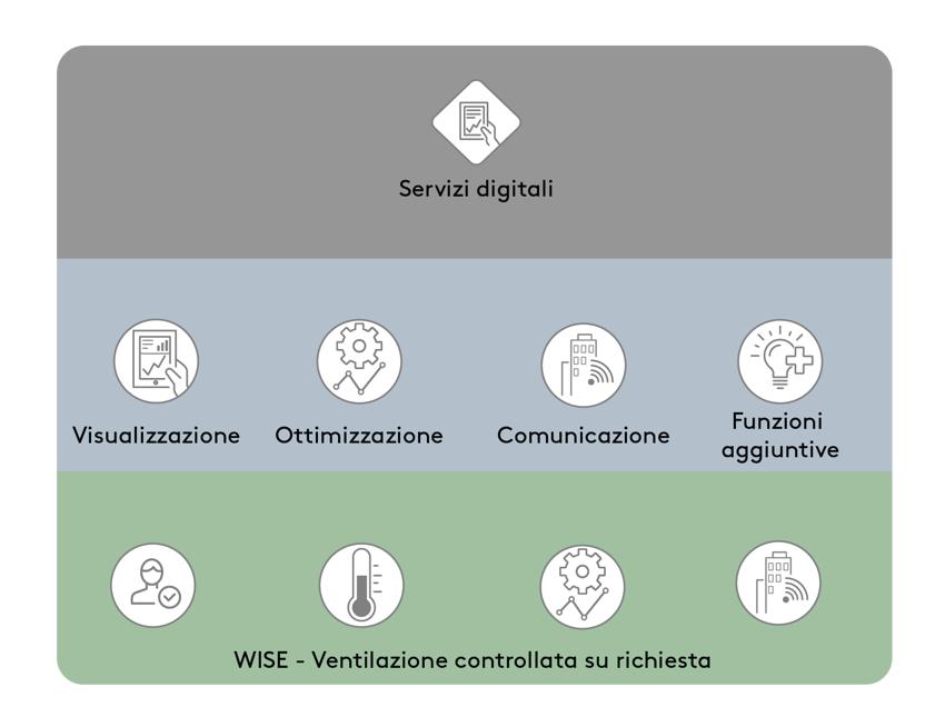 WISE include sempre un pacchetto base per ottenere una climatizzazione interna controllata su richiesta. Oltre al pacchetto base, possono essere aggiunte diverse soluzioni come visualizzazione, ottimizzazione, comunicazione e varie funzionalità. In aggiunta a tutto ciò, possiamo aggiungere anche diversi servizi digitali:​