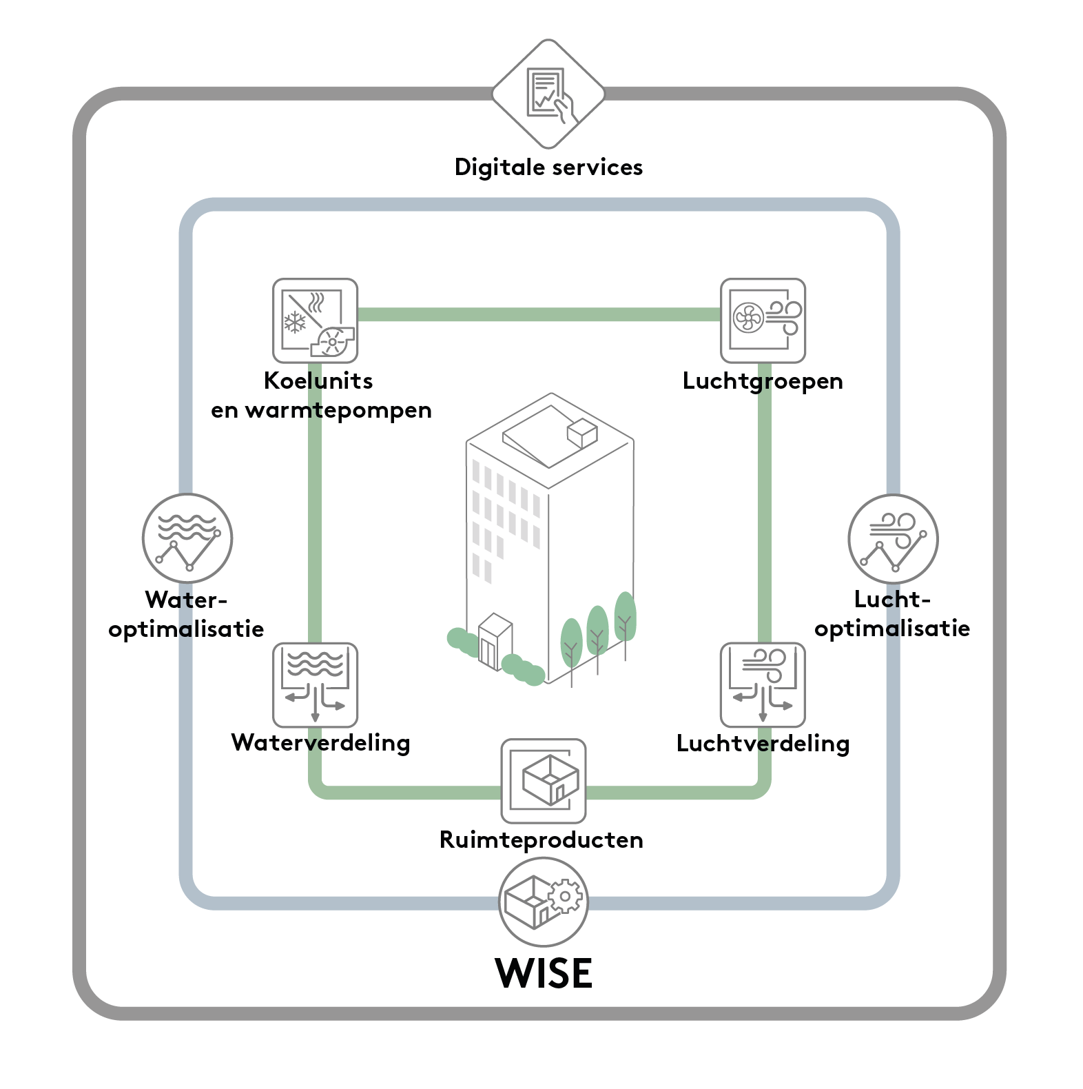 Met WISE is het mogelijk om alle elementen in een klimaatsysteem te regelen, zoals luchtgroepen en klimaatproducten. Maar WISE is ook geschikt voor optimale regeling van water en lucht. Bovendien is het mogelijk digitale services toe te voegen om data over producten en gebouwen te visualiseren en beheren.