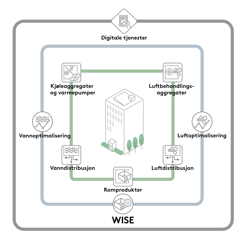 WISE fungerer litt som hjernen i et klimasystem. WISE samler inn data og optimaliserer inneklimaet deretter. Ved hjelp av WISE er det i prinsippet mulig å styre alle elementene i et klimasystem, som luftbehandlingsaggregater og klimaprodukter. I tillegg kan WISE styre vann- og luftoptimalisering. Det er også mulig å legge til digitale tjenester, der data om produkter og eiendommer kan visualiseres og styres.