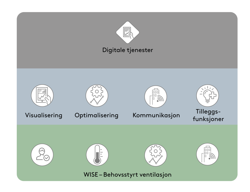 I WISE inngår alltid en basispakke til et behovsstyrt inneklima. I tillegg til basispakken finnes det en rekke løsninger som kan legges til, som visualisering, optimalisering, kommunikasjon og forskjellige funksjoner. I tillegg kan også en rekke digitale tjenester legges til:​