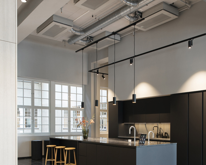 I bygningen er det en variasjon mellom lukket og åpen himling, der teknologien er fullt synlig. I taket er det blant annet benyttet komfortmodulen WISE Parasol EX og den aktive ventilen WISE Sphere Free. Leietaker har muligheten til å justere temperaturen til ønsket verdi via Wise RTA montert på vegg.