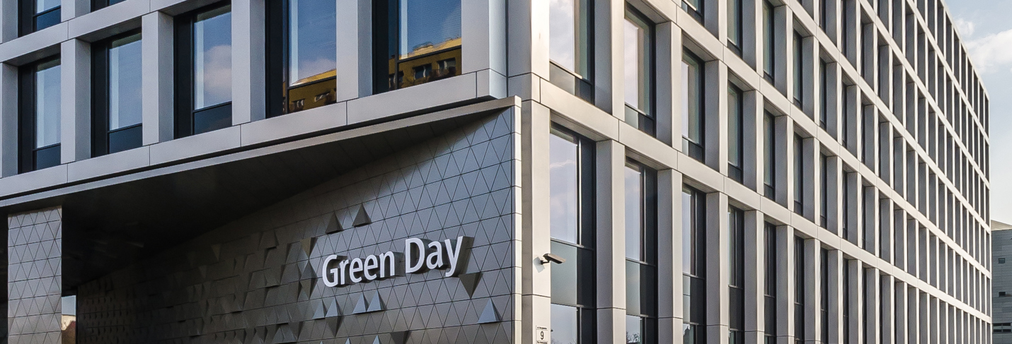 Green Day to nowoczesny biurowiec klasy A, którego charakterystycznym elementem jest aluminiowa mozaika przy wejÅ›ciu oraz jasnoszara elewacja, którÄ… przecinajÄ… równomiernie rozmieszczone okna.