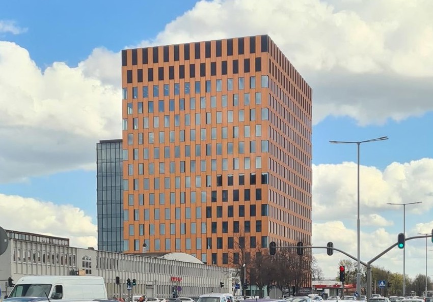 Budynek biurowy posiada elewacjÄ™ wykonanÄ… z elementów moduÅ‚owych o pionowych podziaÅ‚ach w kolorystyce bursztynu.