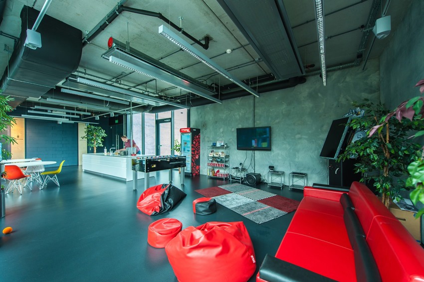 Biurowiec zarówno z zewnÄ…trz jaki i z wewnÄ…trz może sprawiać wrażenie nieukoÅ„czonego, co pasuje jednak do charakteru pracy nowoczesnej firmy programistycznej – pobudza kreatywność, tworzenie i ulepszanie nowych produktów.
