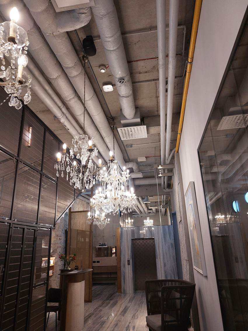 Pokoje oraz przestrzenie publiczne wykonane zostały z połączenia istniejących i odresturowanych elementów z nowymi materiałami, w których dominuje kamień, stal, mosiądz i szkło. Łazienki wykończone są różnorodnymi marmurami wysokiej jakości.