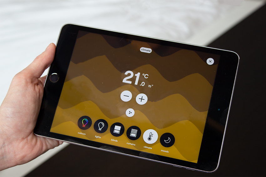 Temperaturę pomieszczenia i ilość nawiewanego powietrza można ustawić na żądane wartości. Aby otworzyć rolety, nie musisz wstawać z łóżka, wystarczy wcisnąć przycisk na moodpadzie. Wolisz chłodne czy ciepłe oświetlenie? Dostosuj je tak, jak chcesz! Możesz nawet wybrać kolor światła! Jeśli masz ochotę na zielone światło w łazience, wystarczy jedno kliknięcie.