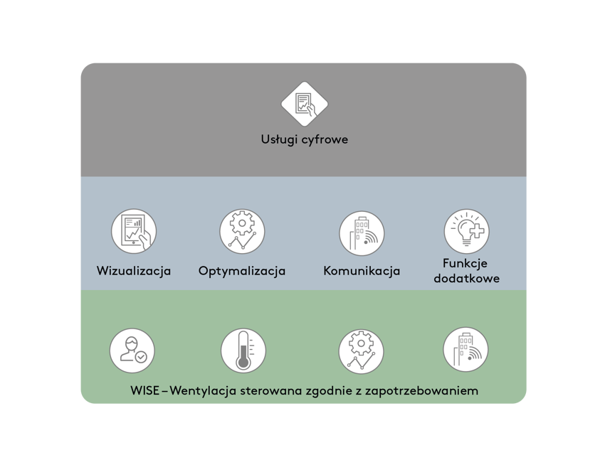 WISE zawiera podstawowy pakiet umożliwiający osiągnięcie klimatu wewnętrznego sterowanego w zależności od potrzeb. Oprócz pakietu podstawowego można dodać szereg rozwiązań, takich jak wizualizacja, optymalizacja, komunikacja i różne dodatkowe funkcje. Ponadto można dołączyć wiele usług cyfrowych:
