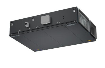 Air handling unit with counterflow plate heat exchanger and side duct connections, with controls.