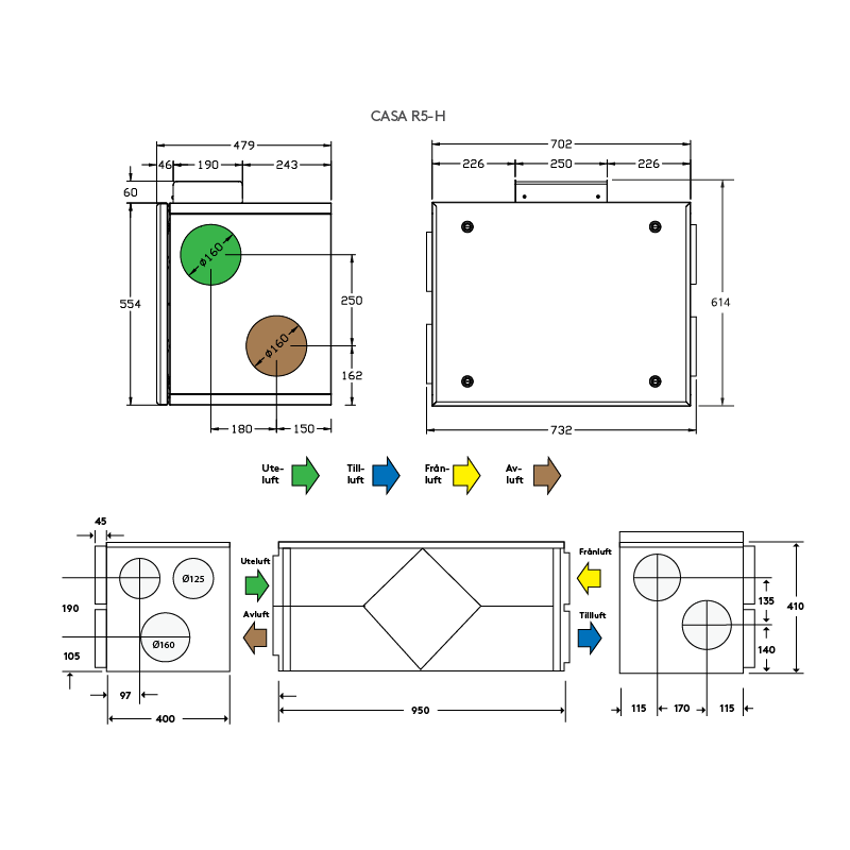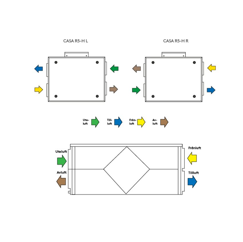 Den övre bilden visar måtten på Swegon CASA R5-H.