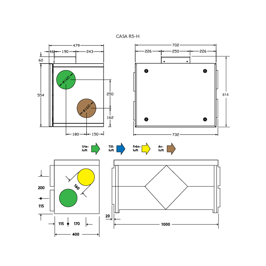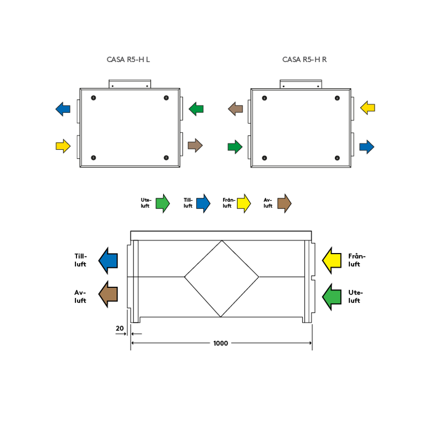 Den övre bilden visar måtten på Swegon CASA R5-H.