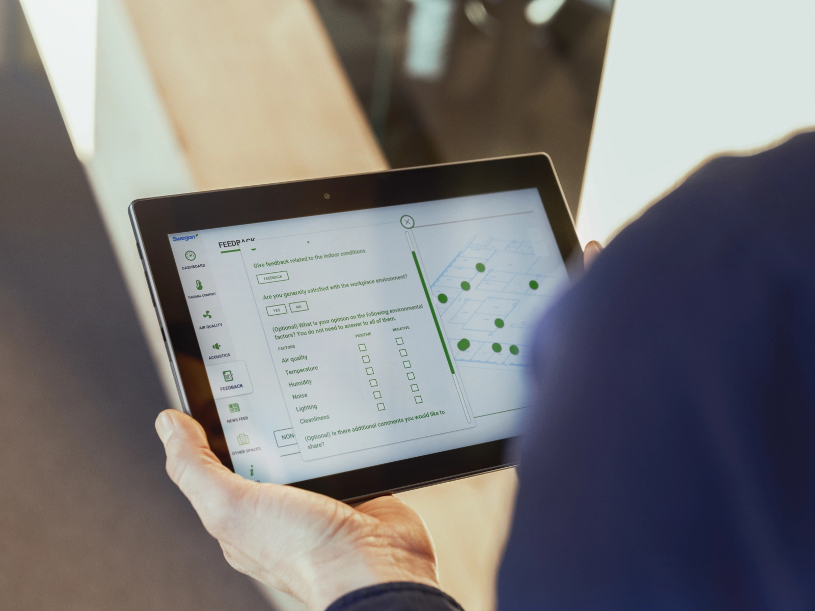 INSIDE Analytics är kopplat till INSIDE Visualiser som tydliggör inomhusklimatet via en skärm i fastigheten på ett lättbegripligt sätt och personer som vistas i fastigheten ges möjlighet att ge återkoppling på upplevt inomhusklimat.