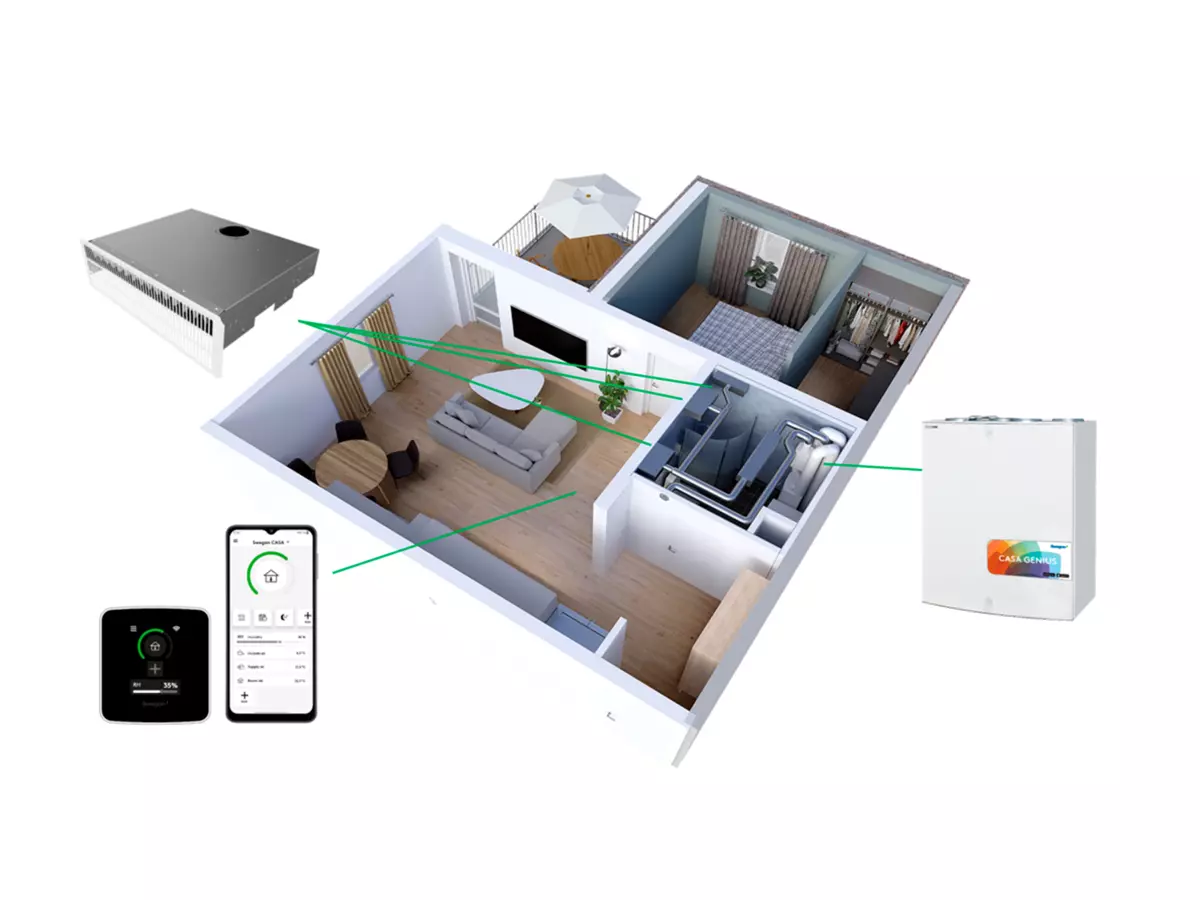 I decentrala ventilationssystem ansluts CCF till ett lägenhetsplacerat Swegon CASA ventilationsaggregat och regleras med styrsystemet CASA Genius