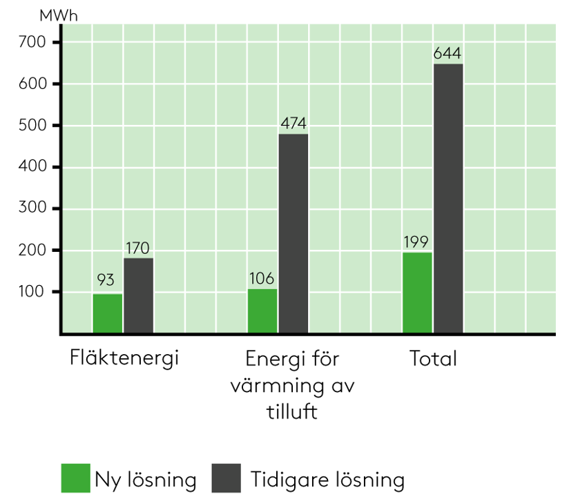 70% i total energibesparing, vilket motsvarar 445 MWh per år