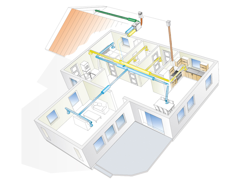 For detached houses there are many options in the way of units, depending on the installation location. For many homes, the choice falls on a horizontal unit for installation in the attic or vertically in a laundry room. In small houses, a “spice rack unit” in the kitchen is also a good solution. In case of ducting difficulties, there is the option of mounting the unit to an exterior wall for minimal ducting combined with active transfer diffusers. However, more than one unit may be needed to meet the air flow requirement.