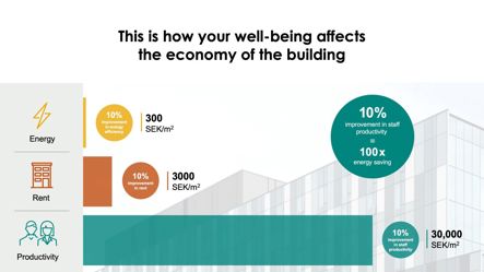 The above is proven in studies which states that people are 16% more productive when working in a good indoor climate, that the number of days of sick-leave are reduced thanks to a good indoor environment and that it is 30% more likely that an employee stays with a company that can offer a productive, healthy and comfortable office. Good air quality is certainly not the only criteria for a good indoor climate, low levels of particles and CO2 in the air have a substantial impact on how information is gathered and used. The below table show a 10% improvement in three typical real estate factors. It is evident that the productivity perspective has a remarkable impact on building economics.